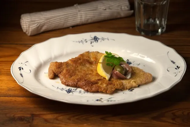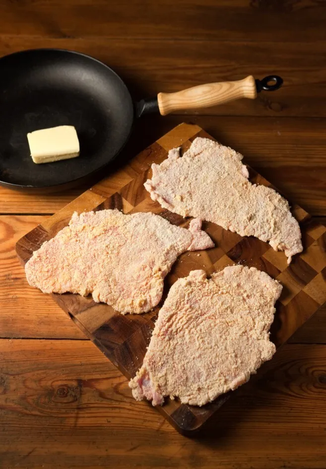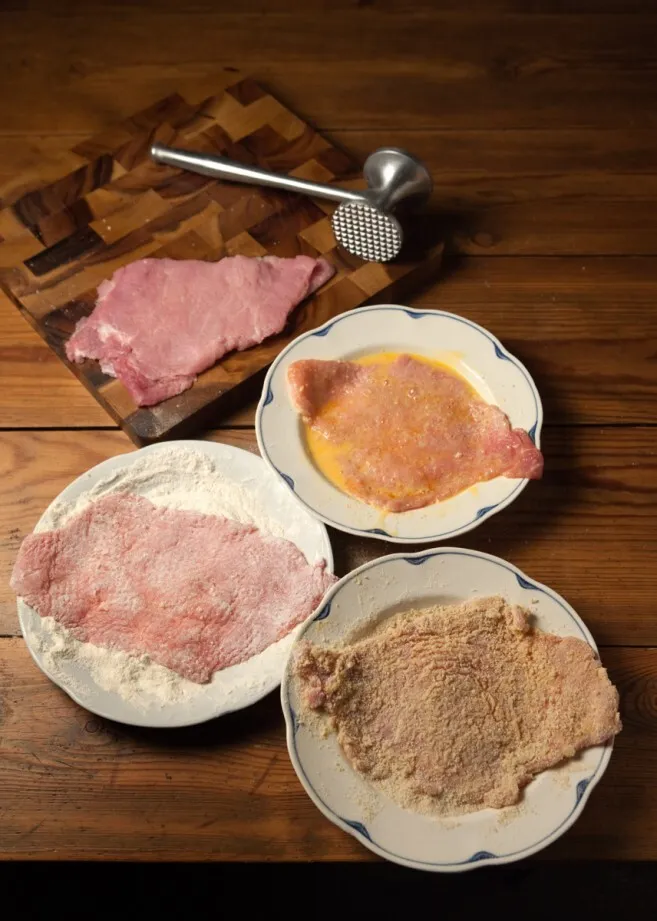 3. Mausta liha suolalla ja pippurilla. Pyöräytä vehnäjauhoissa, kasta kevyesti vatkatussa munassa ja lopuksi pyöräytä leike korppujauhoissa. Anna leikkeiden kuivahtaa vartin verran ennen paistamista, jotta panerointi kiinnittyy lihaan.