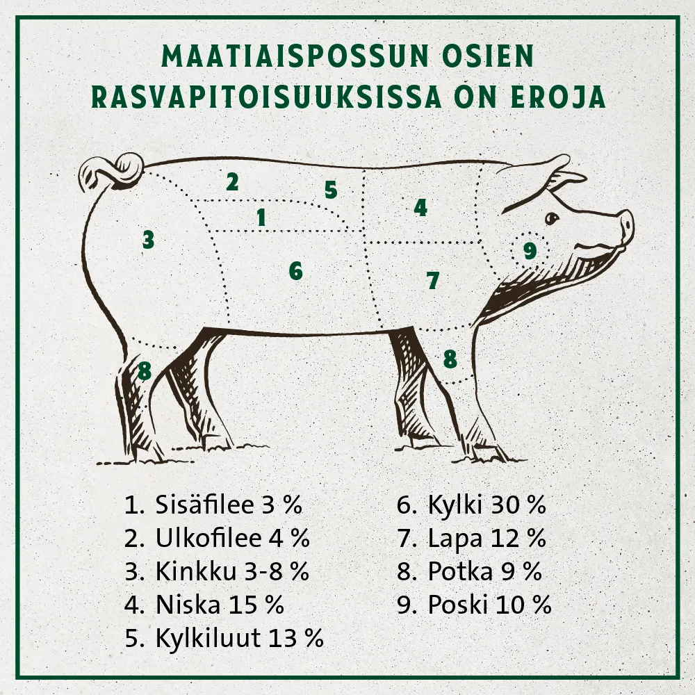 Snellmanin maatiaispossu on monipuolinen raaka-aine. Se ei suinkaan ole kauttaaltaan samanlaista lihaa, vaan eri osat poikkeavat toisistaan ravintoarvojen, rasvapitoisuuden ja ruuanlaitto-ominaisuksienkin perusteella merkittävästi. Tällä tietopaketilla päivität nopeasti osaamisesi kansallispossusta ravintona.