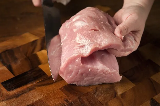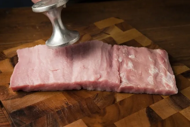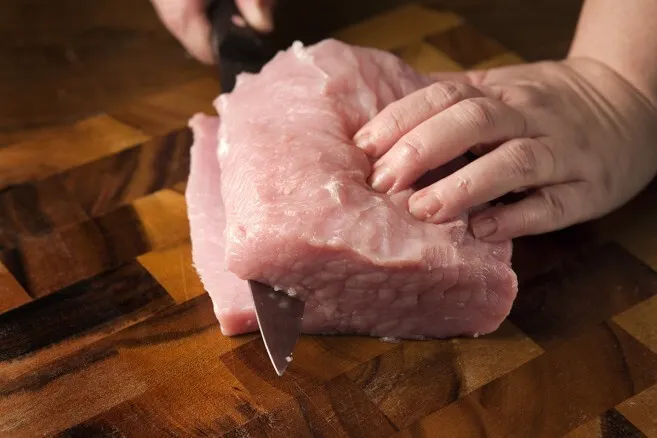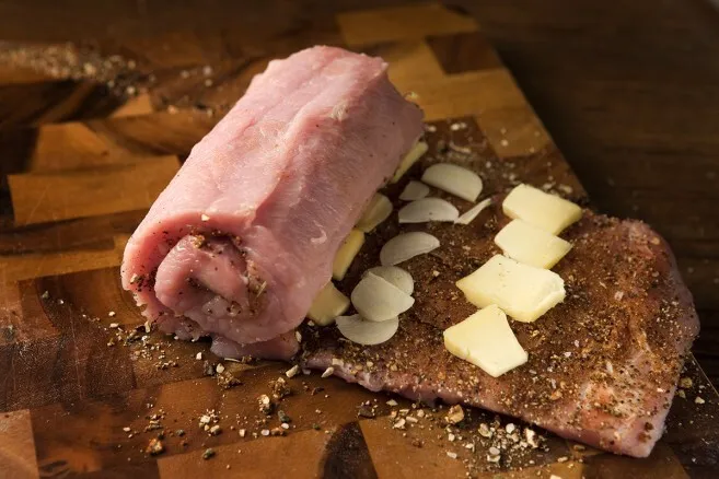 1. Leikkaa porsaan ulkofilee levyksi. Tee ensimmäinen viilto, älä leikkaa läpi, käännä filee. Tee toinen viilto vastakkaisesta suunnasta.