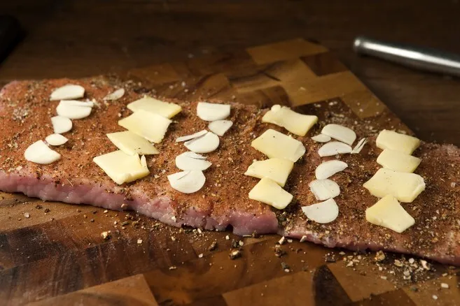 4. Lisää täytteet. Tässä on käytetty grillimaustetta ja Forest Blend -mausteseosta. Kotoa löytyi juuri silloin valkosipulia ja juustoa, ne pääsivät fileen täytteeksi.
