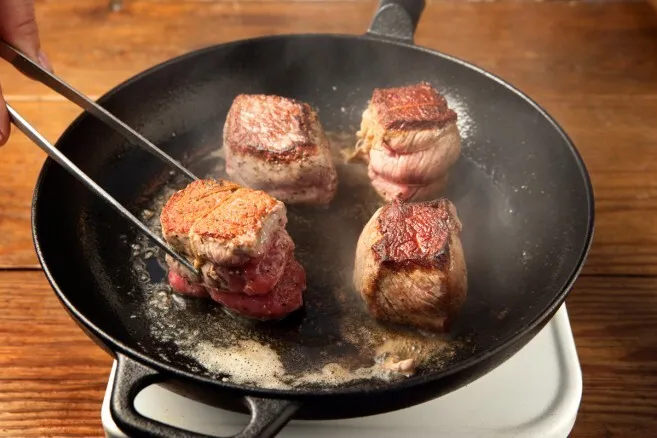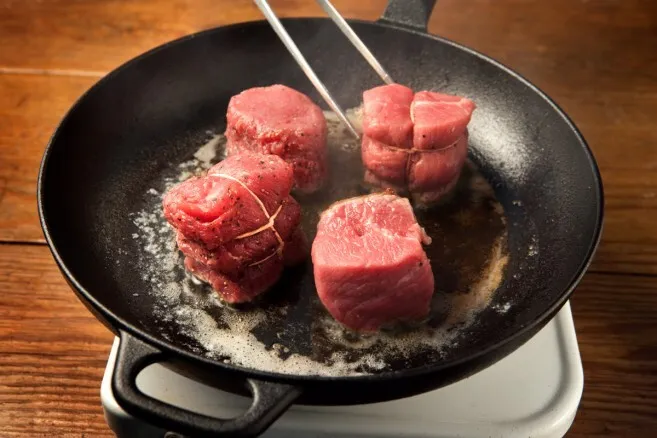 2. Kuumenna pannussa tilkka öljyä ja nokare voita. Kun öljyn pinta väreilee ja rasva hieman ruskistuu on pannu tarpeeksi kuuma. Pane pihvit pannulle. Käännä pihvi kun lihan pintaan nousee lihasnestettä.