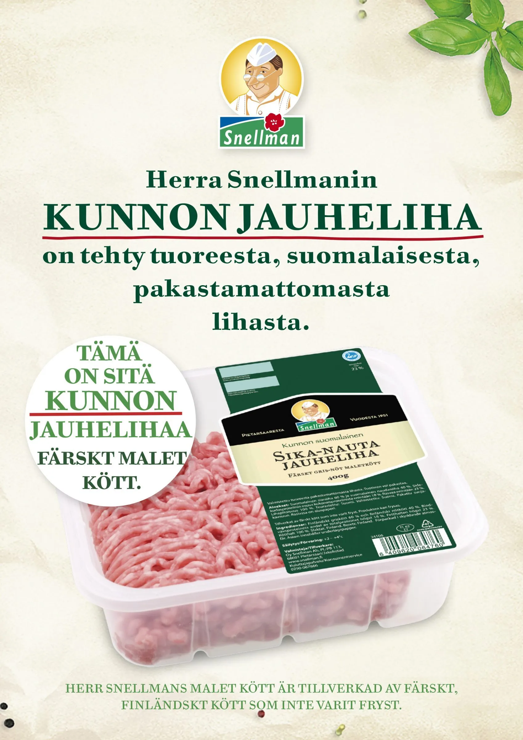 Jo yli vuosikymmenen ajan suomalaisille ruoanlaiton ystäville on ollut tarjolla maultaan ja ominaisuuksiltaan ainutlaatuinen tuote, Herra Snellmanin Kunnon jauheliha. Samat periaatteet – pakastamattomuus, tuoreus ja kotimaisuus – määrittävät vielä tänäkin päivänä tätä arjen klassikkoa.