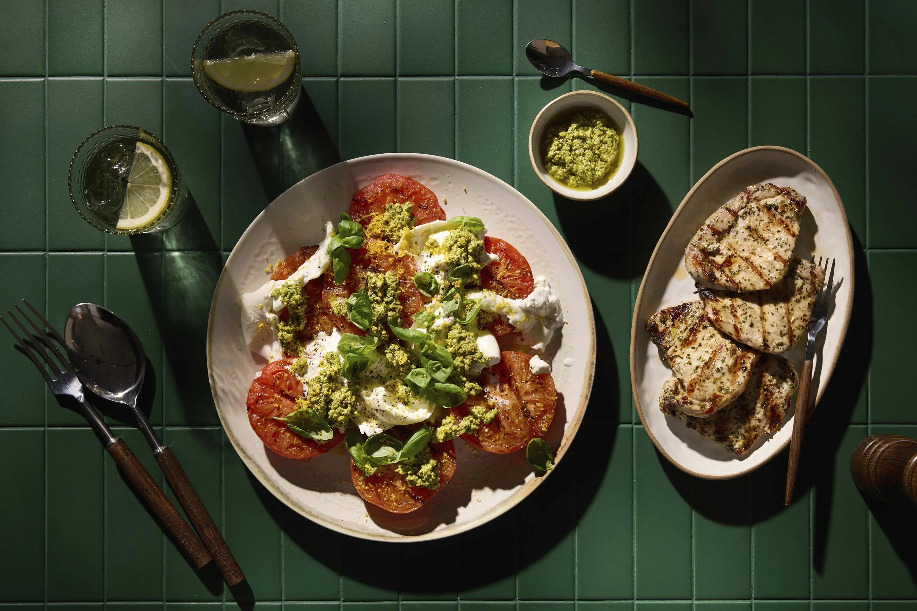 Revi burratajuusto grillattujen tomaattien päälle. Lisää pistaasipestoa, basilikanlehdet ja raastettu sitruunan kuori. Rouhi pinnalle halutessasi mustapippuria. Tarjoa salaatti pihvien kanssa.