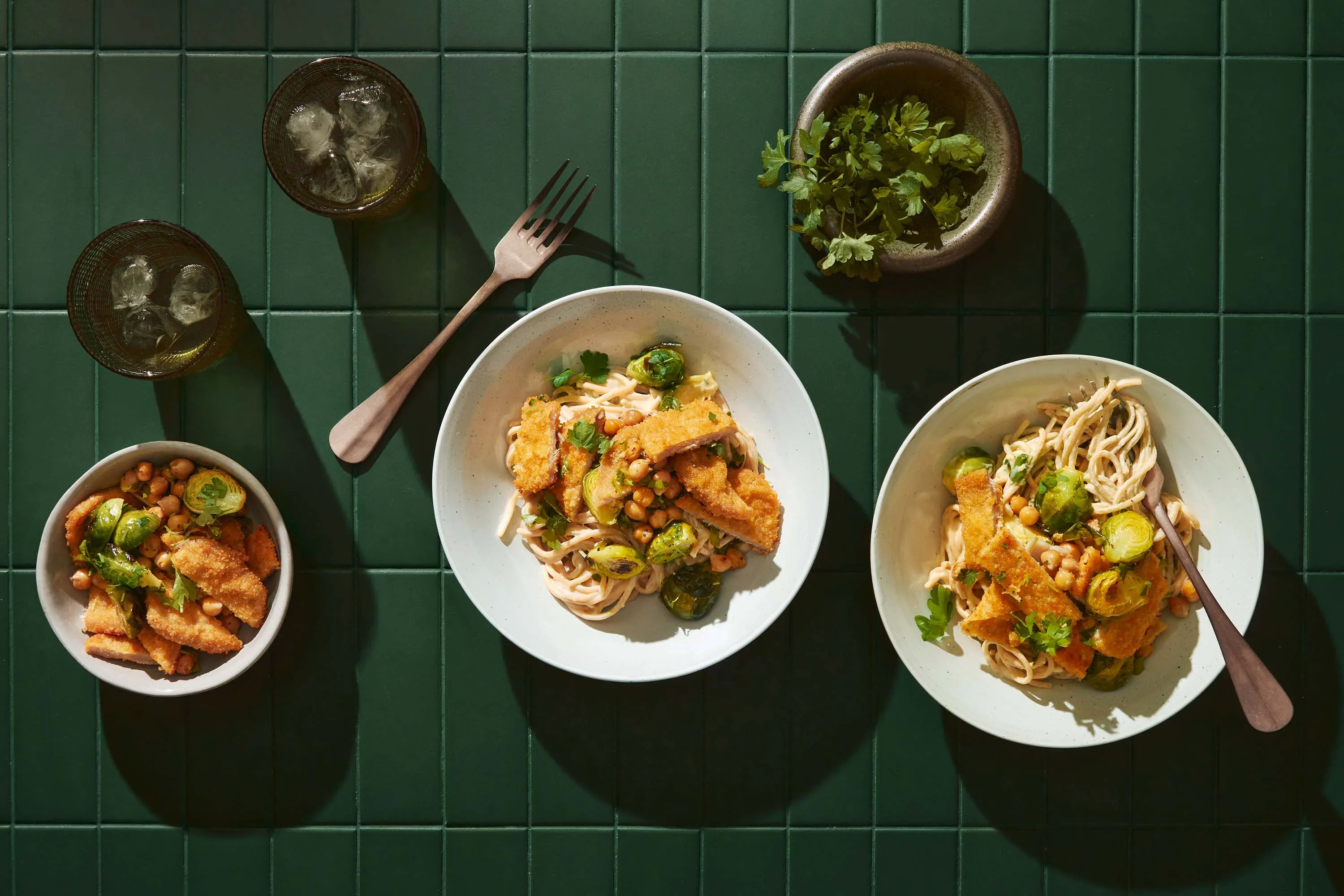 - Annostele lautasille ja lisää päälle loput ruusukaalit, kikherneet ja fileeviipaleet.