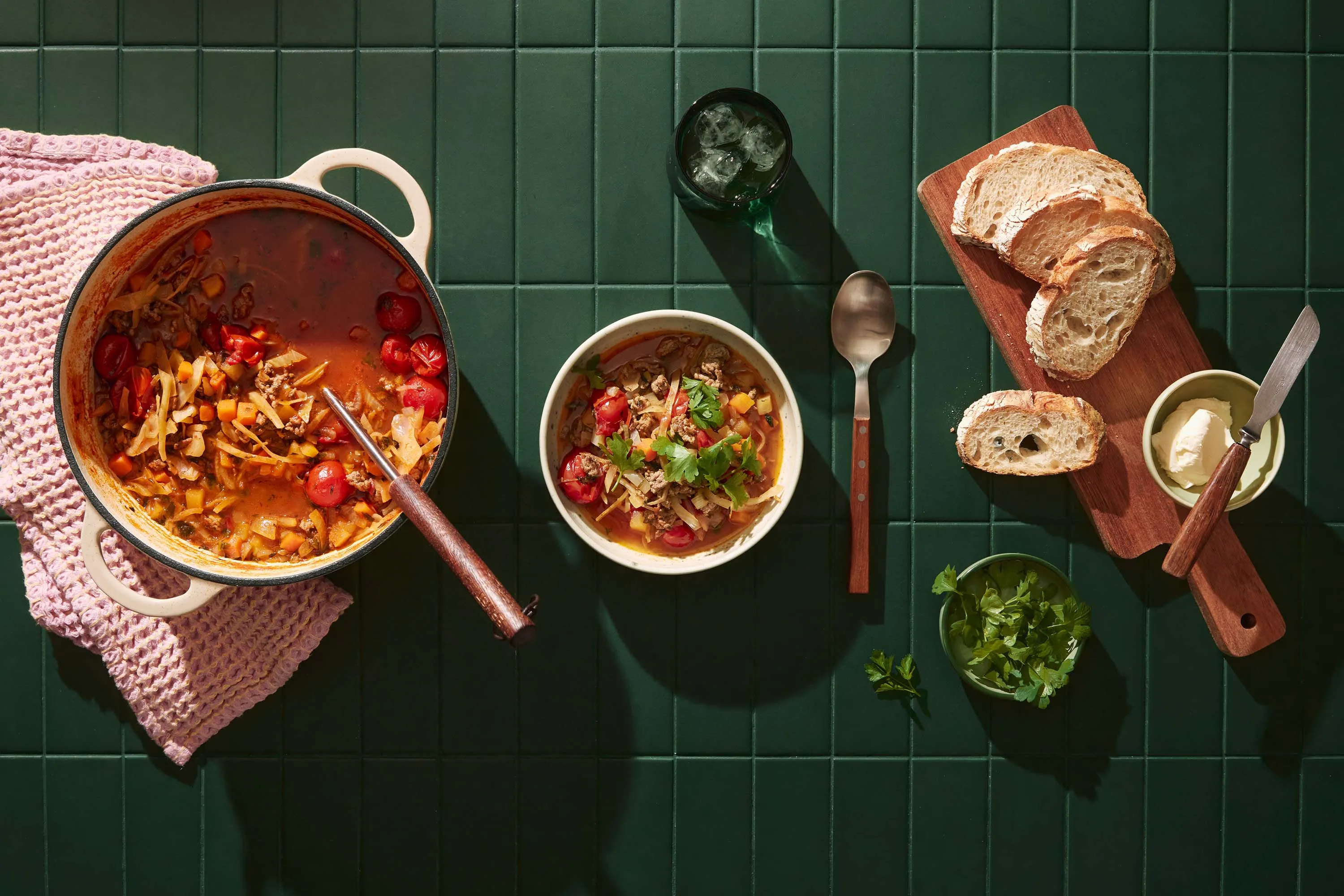 - Lisää jauheliha-sipuliseos, keittojuurekset ja säilykekirsikkotomaatit liemineen. Huuhtele säilyketomaatti tölkki osalla vettä. Lisää loput vesi ja liemikuutio.