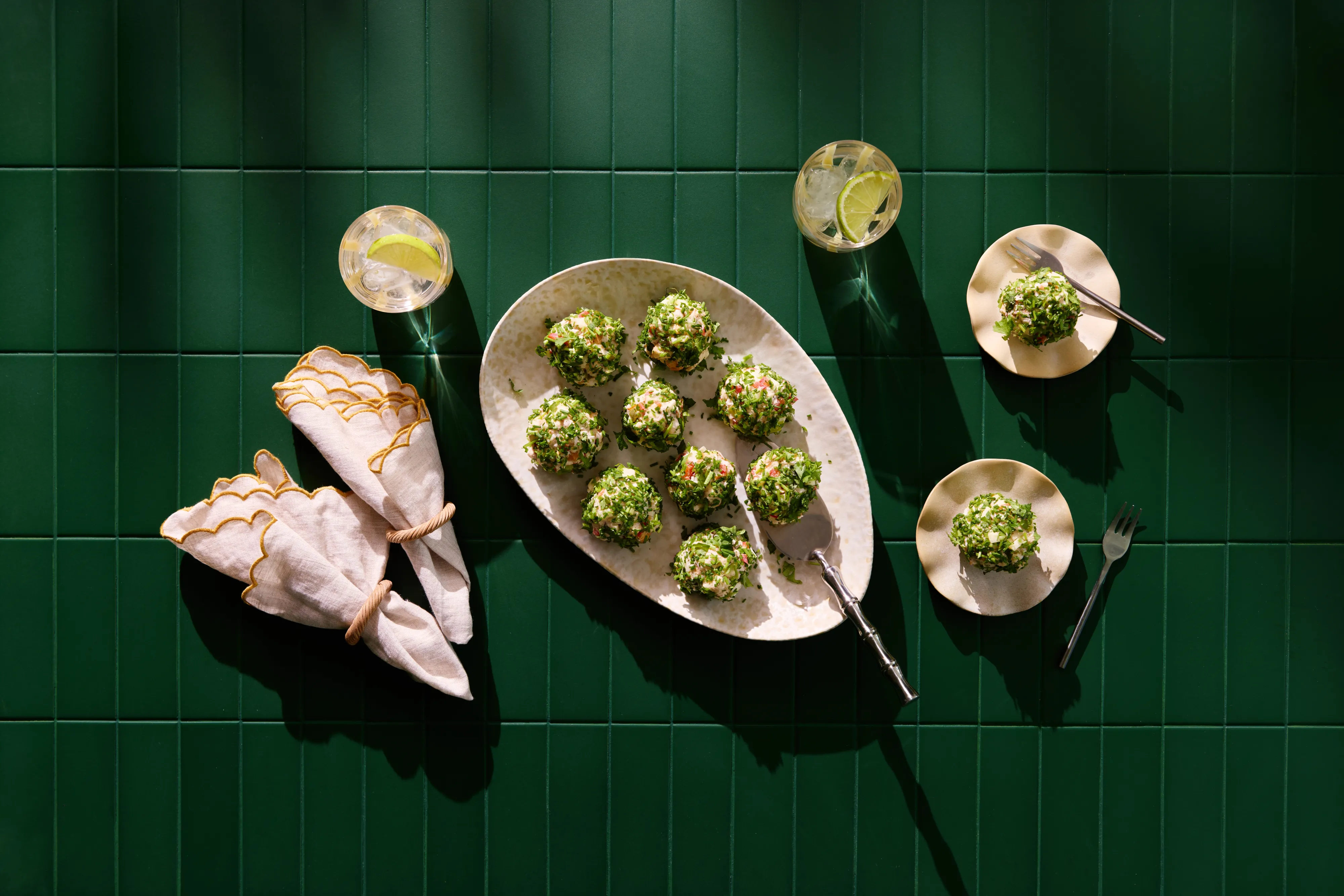 Jaa massa 12 osaan ja pyörittele palleroiksi. Pyörittele pallerot lopuksi hienonnetuissa yrteissä.