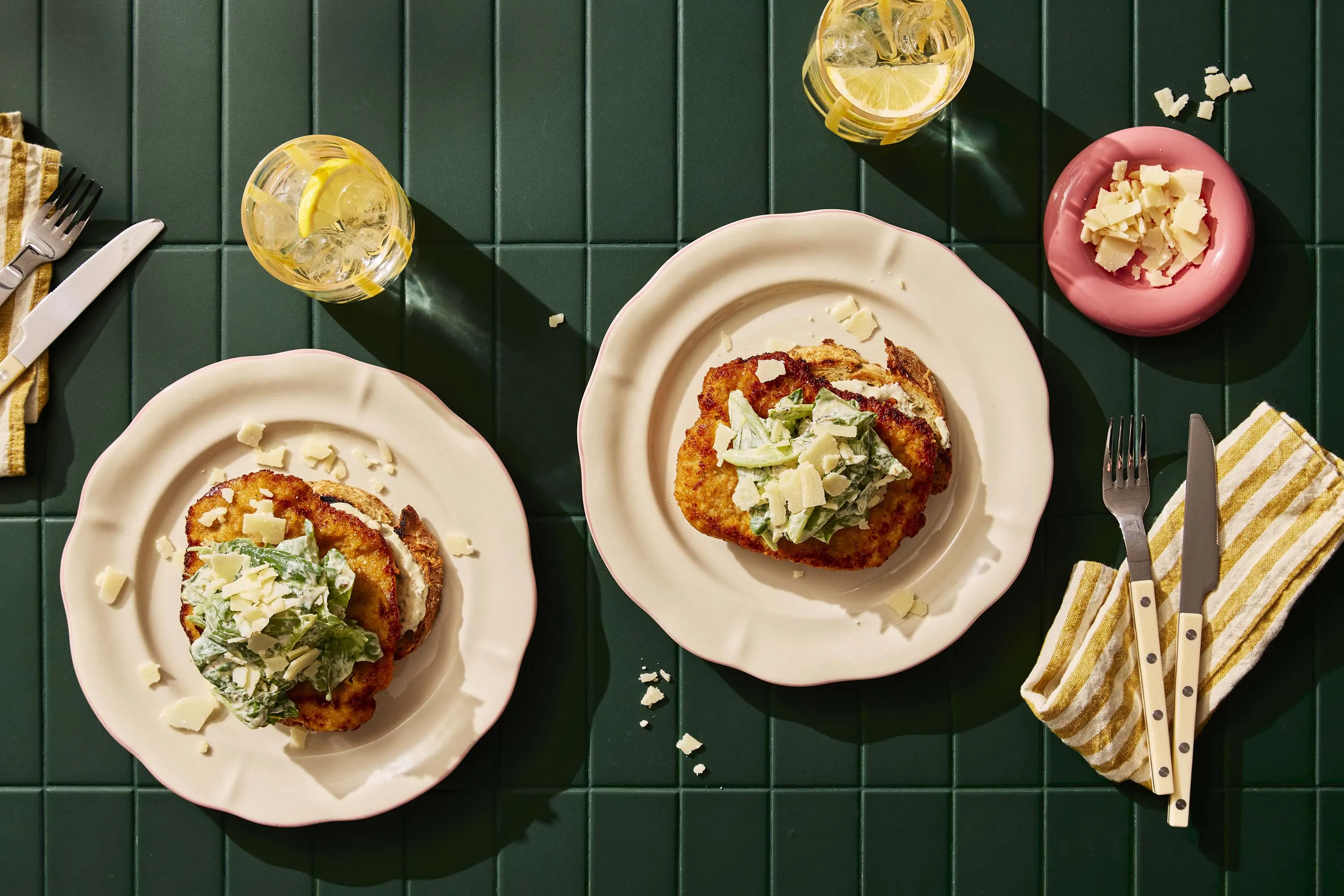 Täytä leivät. Jaa jäljelle jäänyt kastike leipäsiivuille. Nosta päälle paistettu wieninleike. Lisää salaatti ja parmesaanijuustolastut.