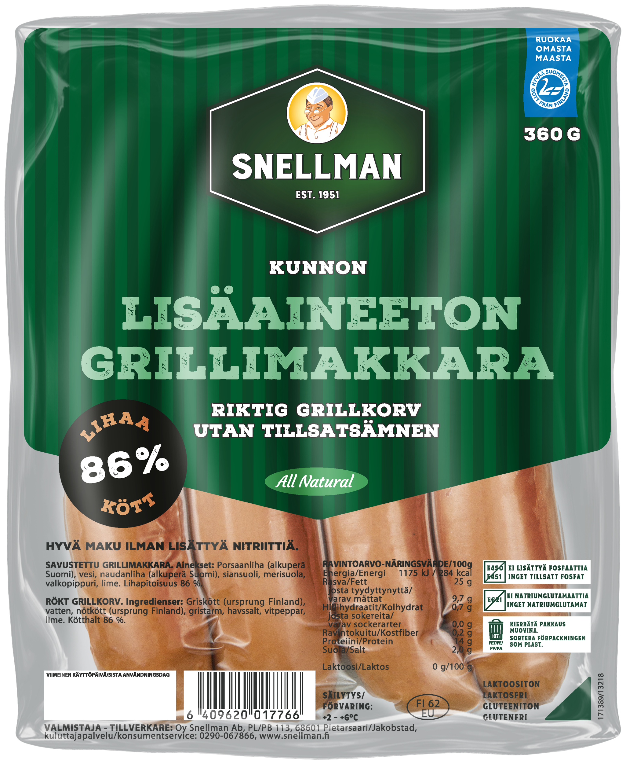 Rehellinen grillimakkara niille, jotka arvostavat yksinkertaisia ja selkeitä raaka-aineita. Kunnon Lisäaineeton grillimakkara valmistetaan kokonaan ilman lisäaineita – mausta tinkimättä. Ainesosat ovat yksinkertaisen hyvät: lihaa, vettä, suolaa ja mausteita. Ei mitään muuta. Mehevä rakenne, herkullinen maku ja korkea lihapitoisuus. Sopii grilliin, nuotiolle ja kaikkeen ruoanlaittoon, koko perheelle.