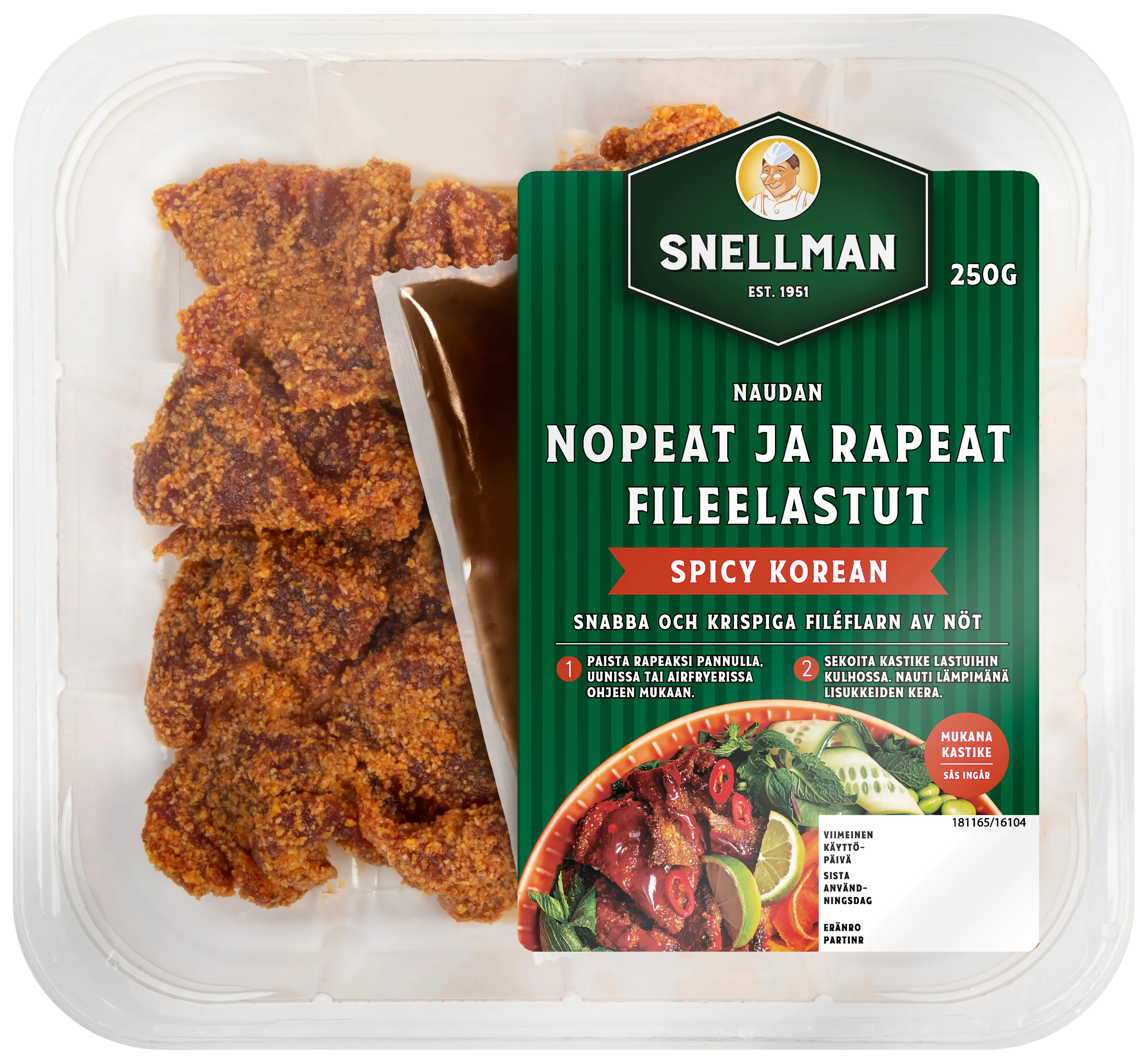 Naudan maissipaneroidut rapeat fileelastut ovat nimensä mukaisesti nopeita ja rapeita. Pakkauksen mukana tulee täyteläisen tulinen Spicy korean -kastike, jossa on juuri sopivasti makua ja potkua. Paista lastut rapeaksi pannulla, uunissa tai airfryerissa, sekoita kastike joukkoon ja nauti vaikka nuudeleiden, riisin tai kasvisten kera.
