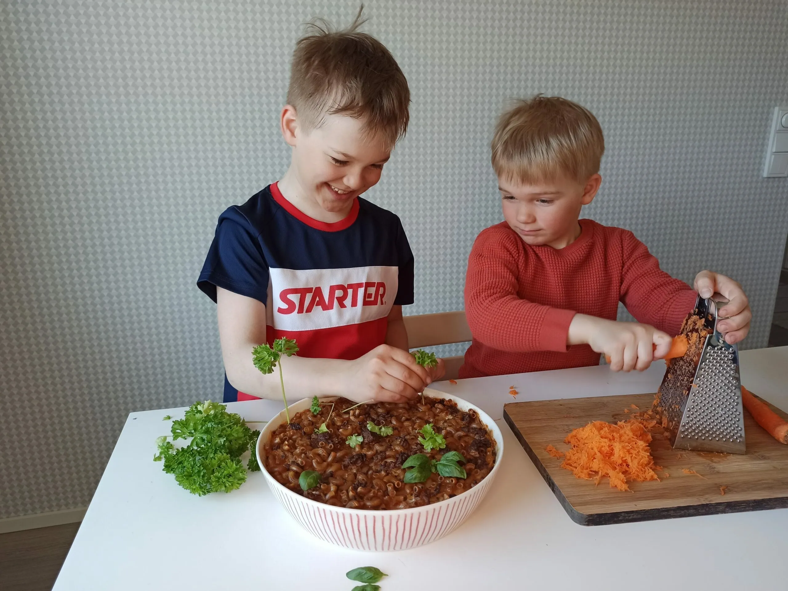 Klassisessa lapsiperheiden ikisuosikissa, lihamakaronilaatikossa, lapset voivat esimerkiksi mitata makaronin, sekoittaa munamaidon ja voidella paistovuoan. Annokseen saa mukavasti väriä esimerkiksi porkkanaraasteesta, jonka voi halutessaan myös sujauttaa munamaidon sekaan.