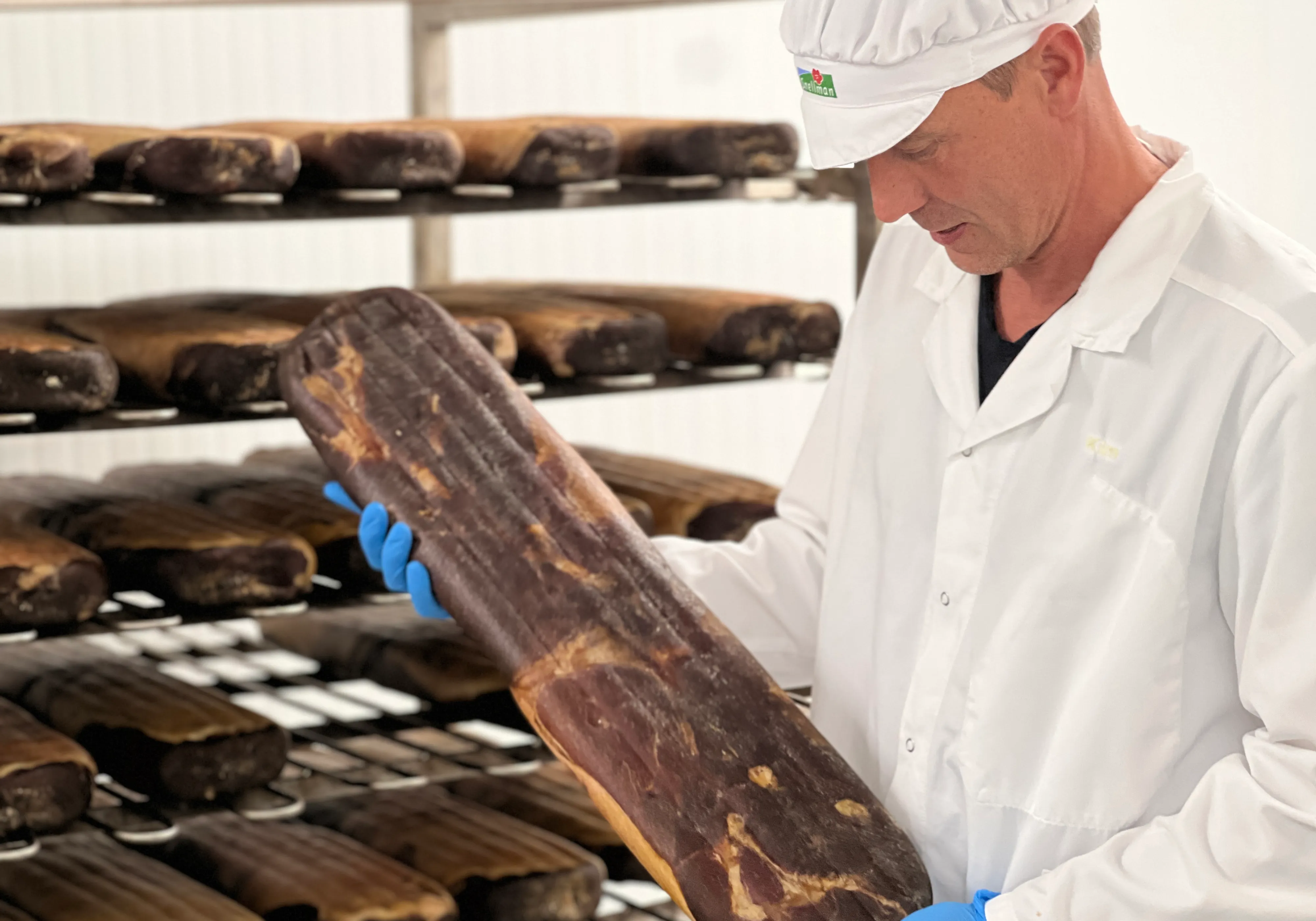 – Kaikki alkaa jo leikkausvaiheessa, kun yhdessä henkilökunnan kanssa valitsemme tarkalleen oikeat kinkut kotimaisesta maatiaispossusta, jotta raaka-aineiden laatu pysyy mahdollisimman tasaisena. Kinkut lajitellaan ja käsitellään erittäin huolellisesti tähän tehtävään koulutettujen henkilöiden toimesta, Finne paljastaa.