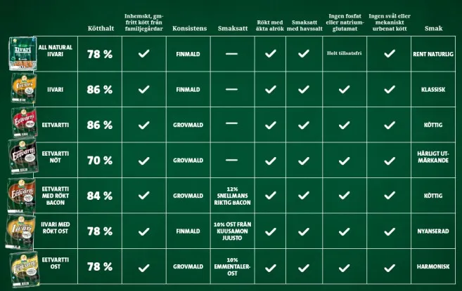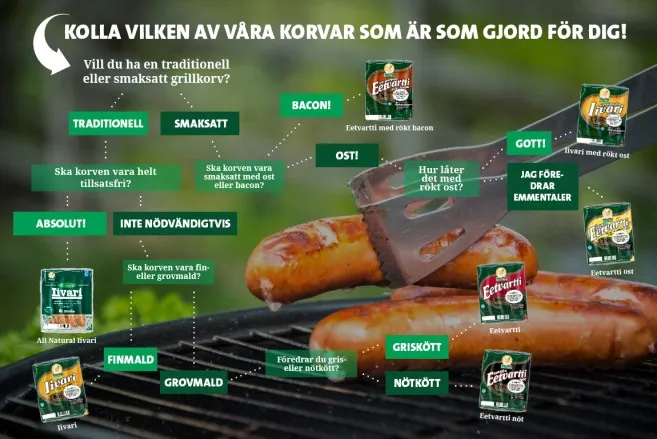 Till sommaren får vi alltid in del frågor angående våra grillkorvar. Det är till exempel ganska många som undrar vad skillnaden mellan Iivari och Eetvartti är, eftersom smaken och innehållet är den samma? Många undrar också vilka smaker utöver Iivari och Eetvartti det finns?