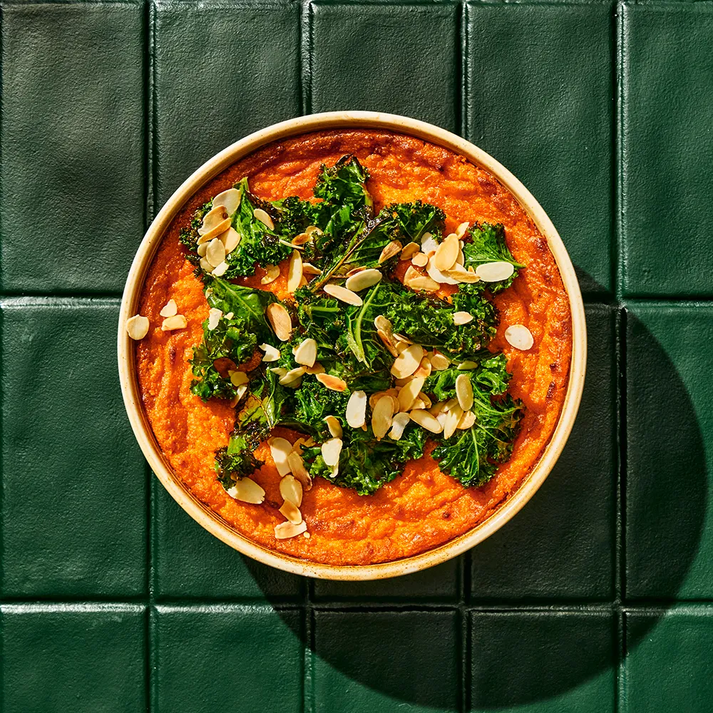 Oavsett om du kör med hemlagad eller färdig morotslåda lyfter detta enkla tips den traditionella helheten till en ny nivå! Morotslådan gör du först mer krämig med hjälp av grädde och gräddar sen i ugn tills den blir saftig med en härligt knaprig yta. En vacker och läcker blandning av grönkål och rostade mandlar sätter pricken över i:et.