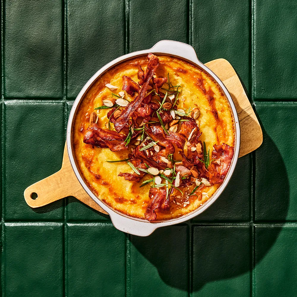 Riktigt bacon, mandelspån och kvistar av rosmarin. Smaker i perfekt balans – den fylliga sötman från potatislådan, sältan från baconet, knaprighet från mandlarna och rosmarinens eleganta arom kommer garanterat att tillfredsställa även den mest kräsna julnjutaren.