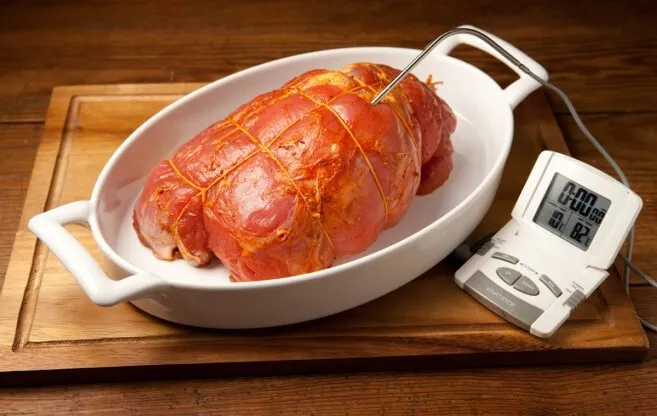 3. Tryck in en stektermometer i köttet. Stek köttet i ugnen i 125–150 grader tills dess att stektermometern visar 80–85 grader.