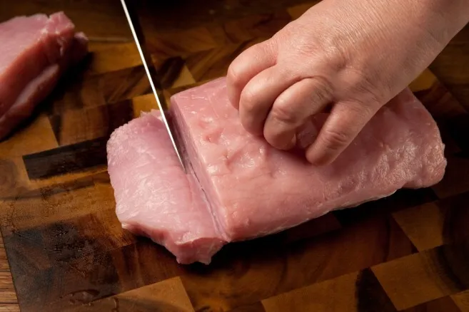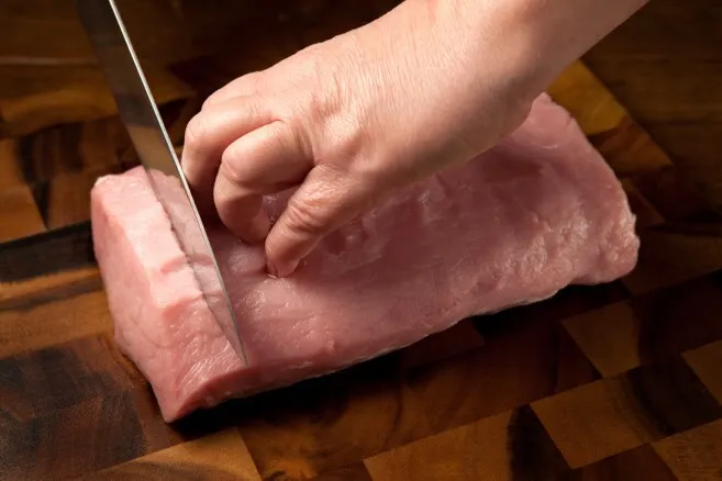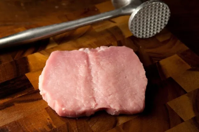 2. Du får fjärilsschnitzlar av gris genom att skära vart annat snitt nästan genom köttet och vart annat helt genom köttet. Köttet öppnar sig till en fjärilsschnitzel där det snitt som gått nästan genom köttet finns.