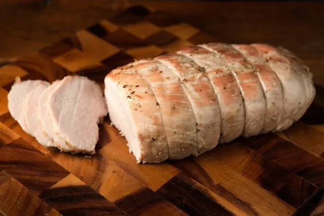 3. Tryck in en stektermometer i steken och stek köttet i 150 grader i ugnen tills dess att stektermometern visar 77 grader.