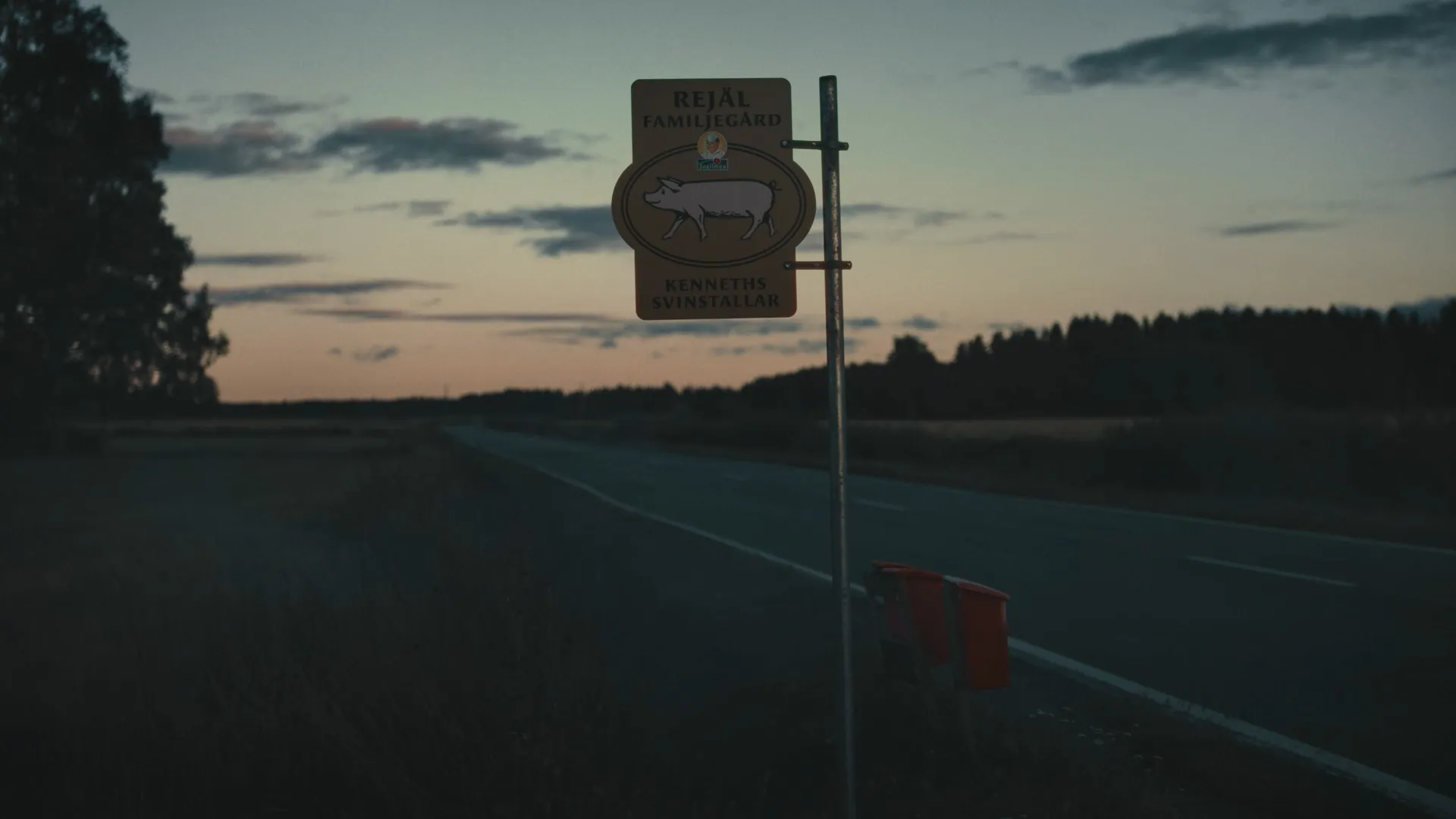 Vid vägen gungar en metallisk skylt i den lätta brisen och med tydliga bokstäver står ”Kenneths svinstallar” skrivet på skylten.