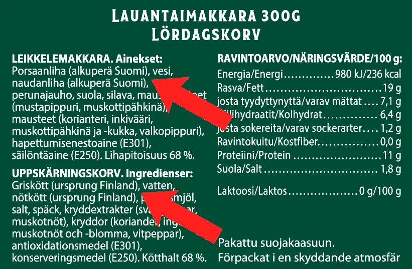 Ifall en i Finland tillverkad produkt saknar den frivilliga Gott från Finland-märkningen måste företag som producerar kött- eller mjölkprodukter berätta om råvarans ursprung i listan över ingredienser. Du kan alltså även spåra inhemska råvaror genom att ta en titt bland ingredienserna. Ursprunget uppges alltid i textform (se exemplet nedan).