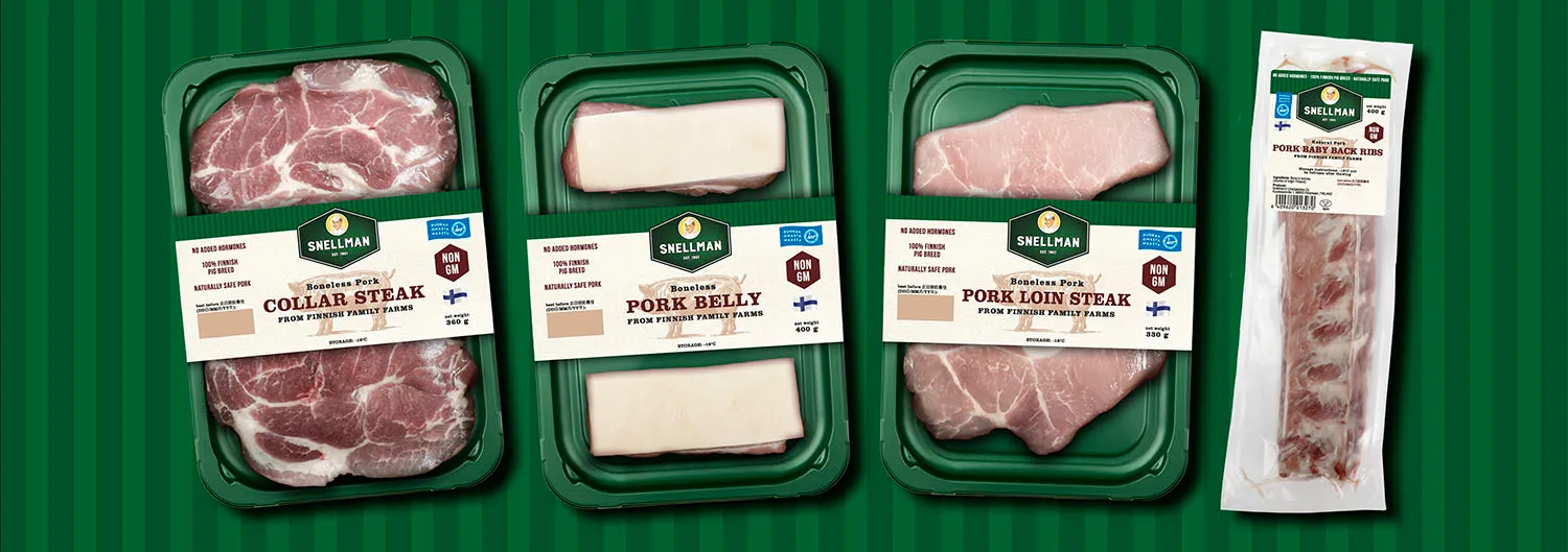 Snellman har arbetat med det aktuella fallet i två år och nu kommer fyra produkter till försäljning i Hong Kong. Dessa är grisnacke, ytterfilé av gris, grissida och en liten förpackning ribs.