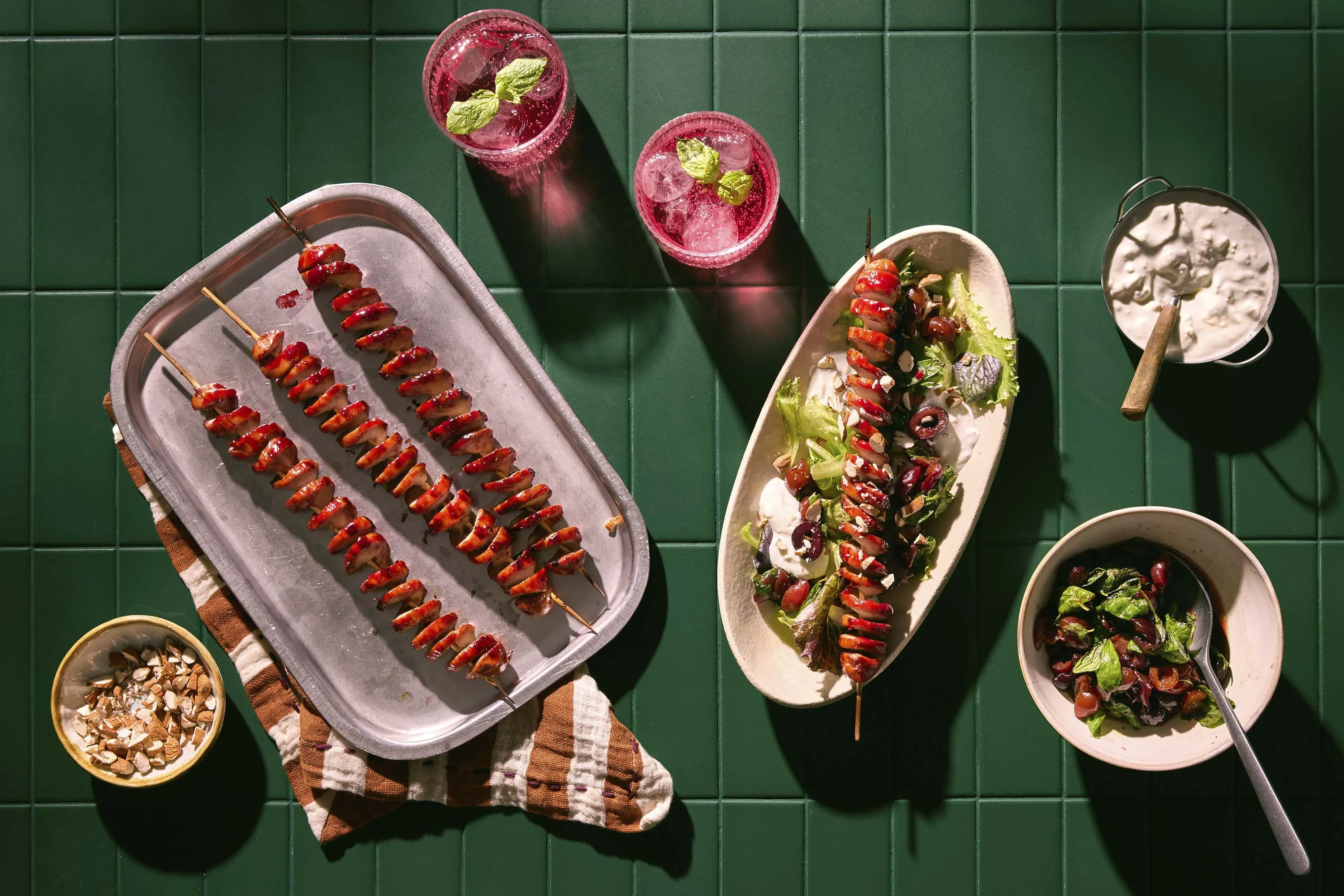 Grilla spetten i 5–10 minuter, vänd dem då och då tills de får fin färg. Pensla med körsbärssylt och grilla ytterligare några minuter.
