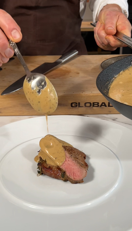 Servera helt eller skivat med pepparsås och valfria tillbehör.