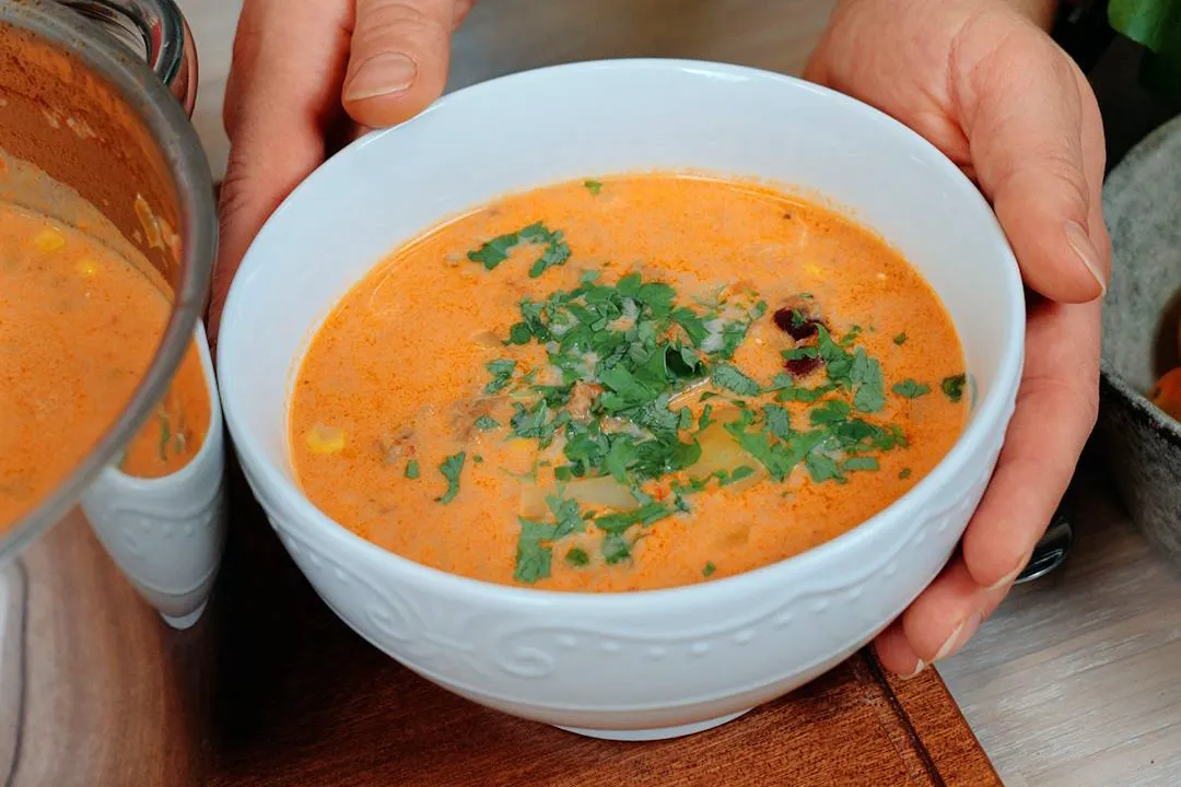 Tillsätt jalapeños, avrunna och sköljda bönor samt majsen. Rör ner färskost och värm soppan på medelvärme tills osten smält och soppan är rykande varm.