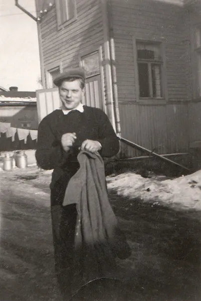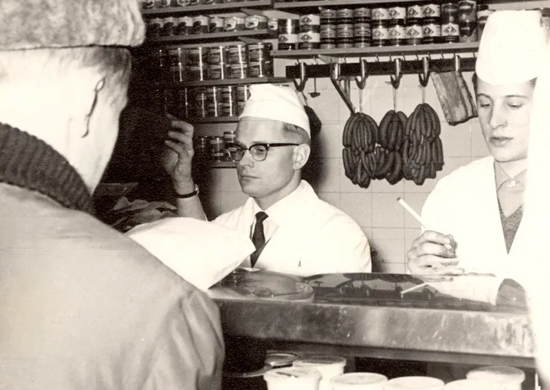Två gånger i veckan begav sig Kurt eller Lars till köttkontrollen i Nykarleby för att göra köttaffärer med privatslaktarna. På bilden har Kurt bytt om från arbetskläderna för att bege sig till Nykarleby. Efter affärsresorna gick bröderna på café till Alsabaren på Skolgatan i Skata och räknade ut den dagens köpesummor. I bakgrunden syns fastigheten på Biskopsgatan 13. I samma byggnad fanns en tid korvfabriken i källaren, butiken SkataCenter och Kurt och Lars familjebostäder. Dörren till höger ledde in till Kurt och Brittas lägenhet, den andra dörren var personalingången till butiken. Butikspersonalens arbetskläder hänger på tork och mjölkhinkarna hör till butiken.