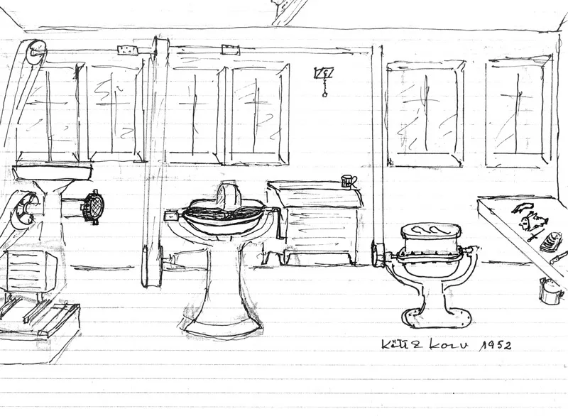 1956: Företaget blir aktiebolag och Per och Karl kommer med i bolaget. Skiss från ett av rummen i källarvåningen på Biskopsgatan 13. Från höger till vänster: köttkvarn, kutter och blandare. Pojkarna hjälptes åt att stycka och skära köttet. Det kött som skulle till korv maldes. Kurt blandade sedan korvmassan i den lilla kuttern som rymde 25–30 liter. Skiss från ett av rummen i källarvåningen på Biskopsgatan 13. Till höger skymtar rökrummet. Kokgrytan befann sig i rummets högra hörn och korvsprutan till vänster.