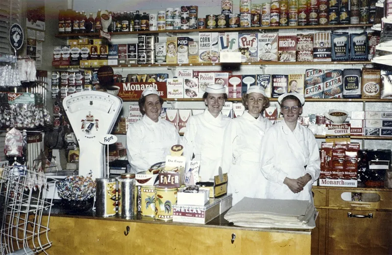 1953–1987: Så småningom utvidgades kundkretsen och snart insåg man att en affär behövdes. Butiken SkataCenter drevs i Snellmans regi (1953–1987) och befann sig i samma byggnad som fabriken och bostäderna på Biskopsgatan 13. Köttet såldes däremot i huvudsak inne i stadens centrum, först i Nya Hallen och sedan i Cityhallen (1956–1971). På bilden från höger butiksbiträdena Anna-Lisa Snellman (f. Ek, gift med Karl år 1955), Anne Lundén, Gretel Wiik och Ulla Karlsson.