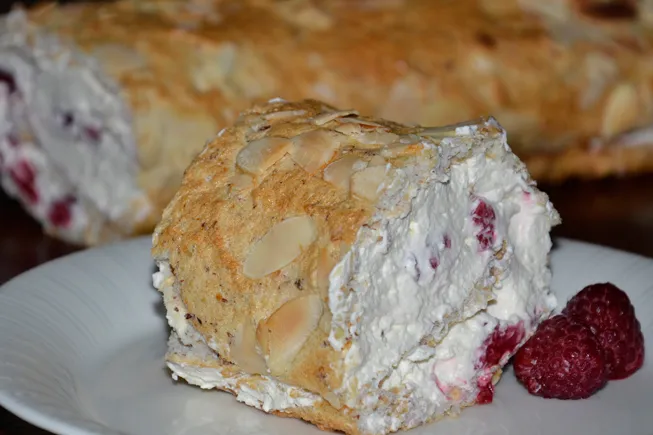 Vispa vitorna till hårt skum, tillsätt sötningmedel, mandelmjöl och krossad mandel. Bred ut på en bakplåt och strö på mandelflarnen. Grädda i 200 grader i ca 150 min. Vänd plattan på ett bakplåtspapper och låt svalna en stund. Gör fyllningen.