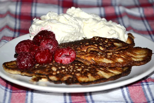 Om du vill kan du mala kokosflingorna med hushållsassistenten för att få finare konsistens. Blanda alla ingredienserna och låt svälla en stund. Stek plättarna och servera med grädde och bär.