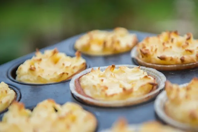 Skala och koka potatisen. Mosa potatisen till potatismos och blanda i grädde och ägg. Krydda med salt och vitpeppar. Linda bacon i muffinsformen och sätt mos inuti. Grädda i 220 grader ca 10 minuter eller tills ytan fått en fin färg.