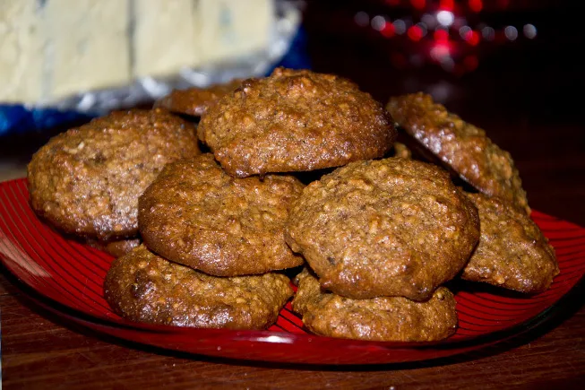 Blanda alla ingredienserna väl. Gör några klickar av degen på plåten med en sked, och grädda i ugnen på 200 grader i ca 8 min. Låt svalna och servera med blåmögelost.