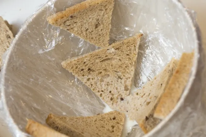 Fodra insidan av en rund skål med färskfolie. Skär bort brödkanterna och skär skivorna sen till trekanter eller i vilket format du önskar. Doppa brödskivorna i mjölken. Placera dem i skålens botten och kanter.