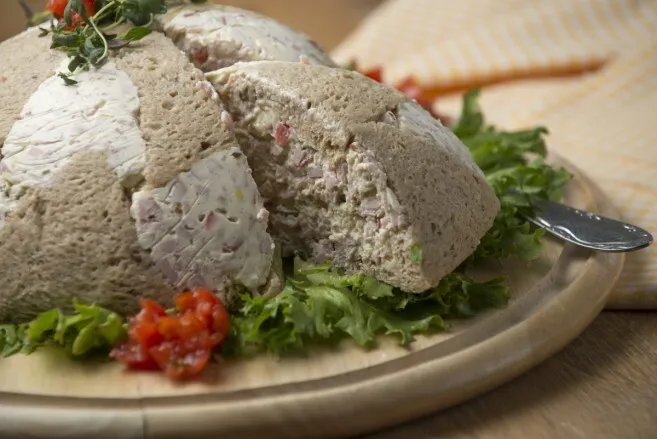 Blötlägg gelatinbladen i kallt vatten. Hacka skinkan och purjolöken. Tärna gurkan och paprikan i småbitar. Blanda fyllningens ingredienser och krydda. Värm en skvätt vatten kokande och smält gelatinbladen i vattnet. Blanda gelatinbladen i fyllningen, rör om väl. Häll fyllningen i skålen och jämna ut ytan. Sätt påett varv med bröd som du doppat i mjölk. Täck med folie och låt tårtan ståi kylen minst 3 timmar, men gärna till följande dag. Dekorera om du vill.