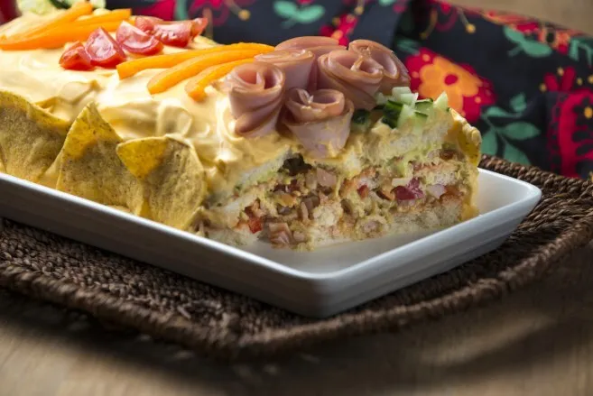 Gör garneringen. Blanda en burk crème fraiche med ostdippen, bred över kakan. Dekorera tex med paprika, körsbärstomater och gurka, sätt Nachos påkanterna. Servera.